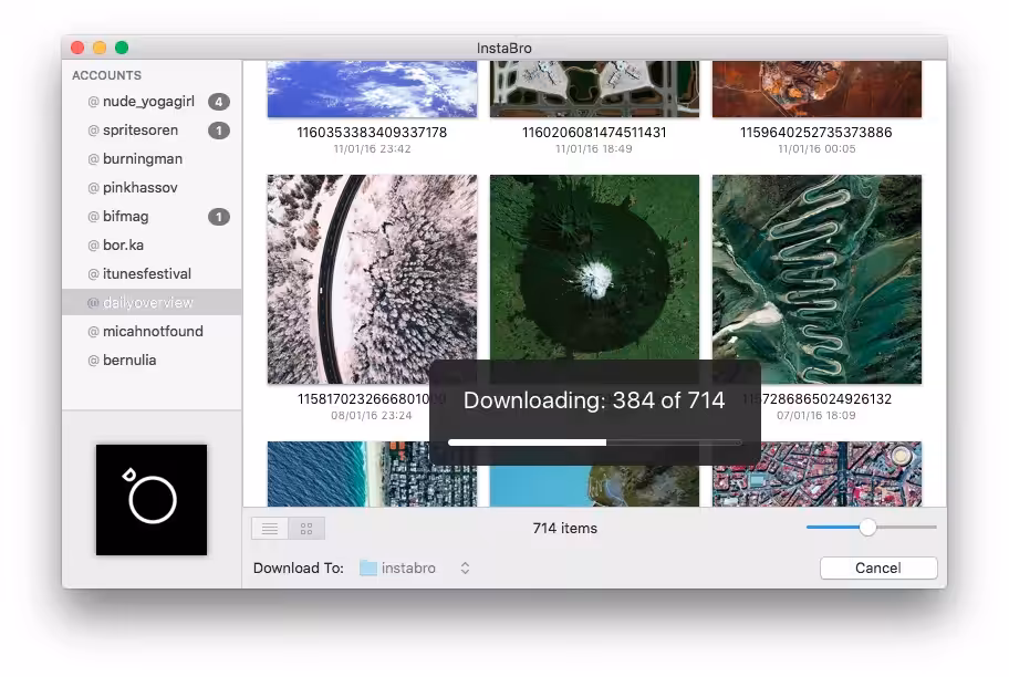 InstaBro is a simple Instagram browser that allows you to explore media by user, hashtag, or location in the most convenient way. You can also export all data to a CSV file.